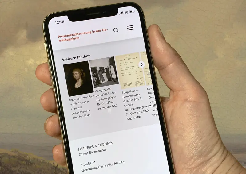 Die Daphne-Datenbank ist auch die Basis für den Multimediaguide der Staatlichen Kunstsammlungen Dresden, mit dem es möglich ist, die teils komplexen Herkunftsgeschichten von einzelnen Kunstwerken anschaulich zu erzählen und ganze Rundgänge zu gestalten. Die Besucher*innen können diese Geschichten sowohl vor Ort als auch digital in deutscher und englischer Sprache entdecken, Abbildungen von Rückseiten mit überlieferten Spuren sehen und historische Inventare, Schriftstücke oder Fotografien aufrufen.