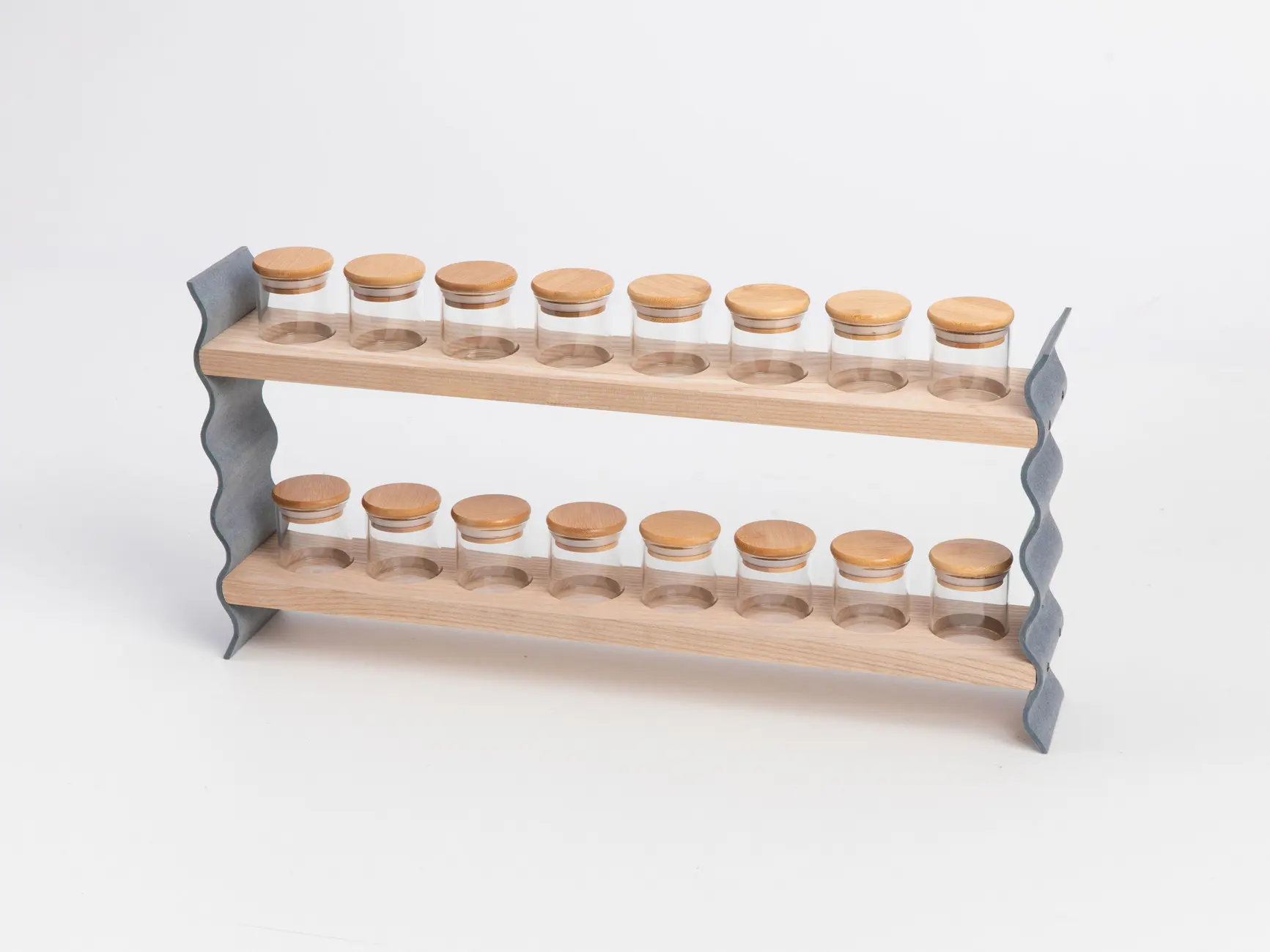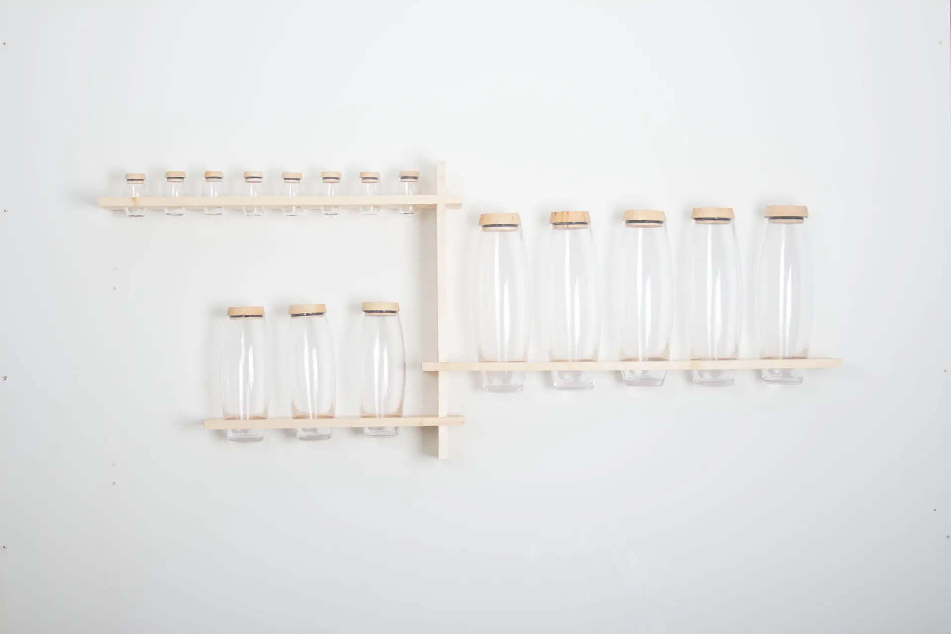 „Das Küchenregal verfügt über ovalförmige Gläser in drei verschiedenen Größen. Es gibt insgesamt fünf große Gläser, die ideal für Nudeln, Reis oder Mehl sind. Die mittlere Größe eignet sich hervorragend für Nüsse oder Zucker, von denen es drei Stück gibt. Die fünf kleinen Gläser sind für Gewürze gedacht. Alle Gläser sind mit einem gedrechselten Deckel und einem Gummiring für einen luftdichten Verschluss ausgestattet. Die Gläser sind in drei waagerechten Regalbrettern durch ein Loch eingelassen, die von einem senkrechten Brett verbunden sind.“ (Hannah Bayer)