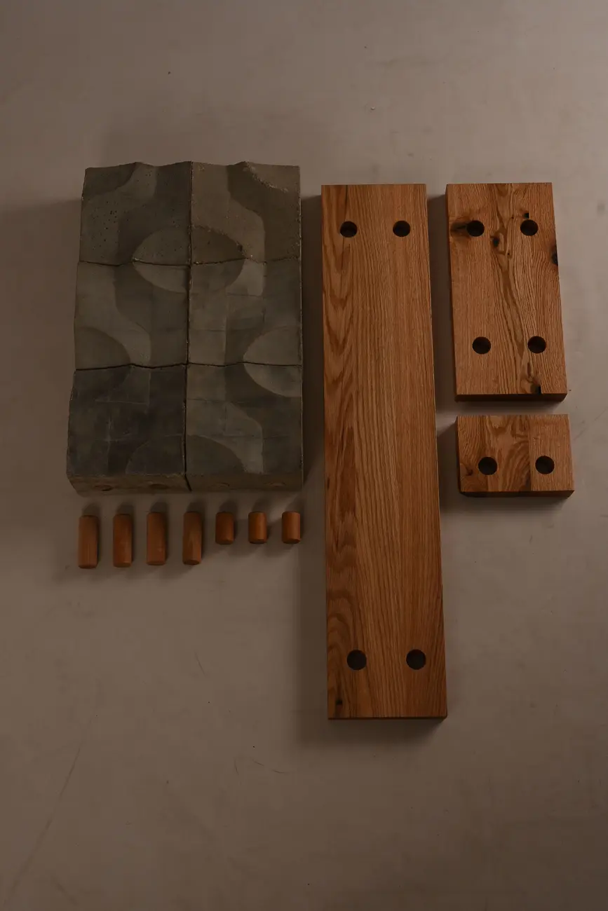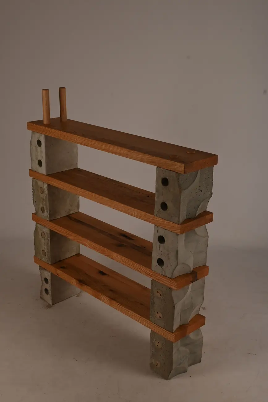 „Konkret ist eine Neuinterpretation des Betonformstein-system von Kracht und Adler. Bei Konkret handelt es sich um ein Betonformstein-möbel-System, das aus 3 Bestandteilen besteht. Betonwürfeln(21*21*14cm) Holzbrett(21*15/45/105/4cm), Holzstiften. Aus diesen Bestandteilen kann man individuell und modular Möbel zusammenstellen. Es sind zahlreiche Zusammenstellungen möglich wie, Tische, Regale, Stühle, Hocker, Betten uvm...“ (Nick Bechinger)